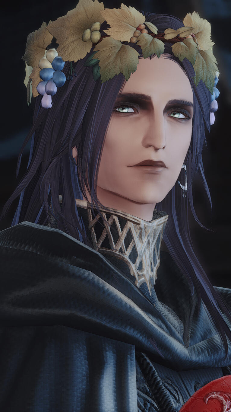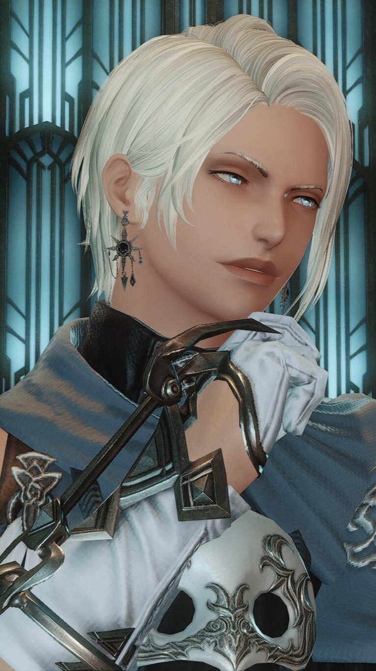 Personality and some more info:Ursulin is generally quiet and introverted. He prefers his own company and keeps social interaction at bare minimum necessary to everyday function. As a result of mistreatment as a Duskwight growing up in Gridania, he developed a distrust to others - particularly Wildwood Elezen or Hyurs.Ursulin emanates a rather depressing aura and isn't a particularly positive person. Most of the time he can be found brooding somewhere, preferably in a dark place. He likes to meditate in a complete silence when he feels overwhelmed and overstimulated after a busy day.Despite his negative and broody nature, Ursulin actually puts a lot of care into his personal hygiene and physical appearance. He will never be caught looking unkempt and loves stuffing his wardrobe with really fashionable outfits. If asked why he cares so much, he will always reply "I shall not be seen looking worse than a Wildwood bastard." and so far he managed to put even some Ishgardian nobles to shame.While officially a White Mage, Ursulin only carries the Job Stone as a little souvenir of sorts. After "gravely offending the Elementals" he became unable to commune with them. He's still trained as a Conjurer and is perfectly capable of using this type of magic. However, instead of using the nature's aether, Ursulin's only way of using his White Mage powers is to "borrrow" the aether from another living being. An exchange of life for life - with the scale of "sacrifice" depending on the injury he needs to heal.The tattoos Ursulin has on his body are aether markings, used to store the energy he absorbs from his "sacrifices". The enchanted ink glows brighter if he overloads himself with aether and Ursulin needs to convert the energy into either healing or offensive magic. Otherwise it brings him immense pain.A "short" history: